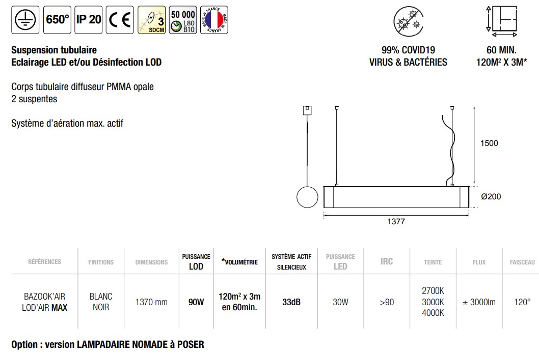Massif, ce purificateur d’air en suspension ou en nomade a été conçue pour les grands espaces clos de tout type d’activité. (Vestiaires, salle de sports, boites de nuit, théâtres, cinémas, salles de conférences…)